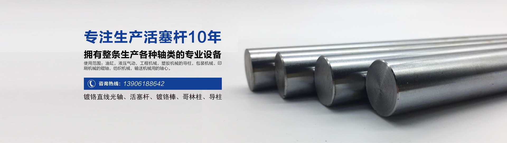 公司專業生產活塞桿,直線光軸,鍍鉻棒高頻軸,氣缸活塞桿,液壓油缸活塞桿,調質軸,空心管導柱等。公司擁有整條生產各種軸類的專業設備,生產的軸直線度高,表面光潔度好,硬度均勻。公司產品經過校直、粗精無心磨削、鍍鉻與多道精細拋光工藝加工而成。
